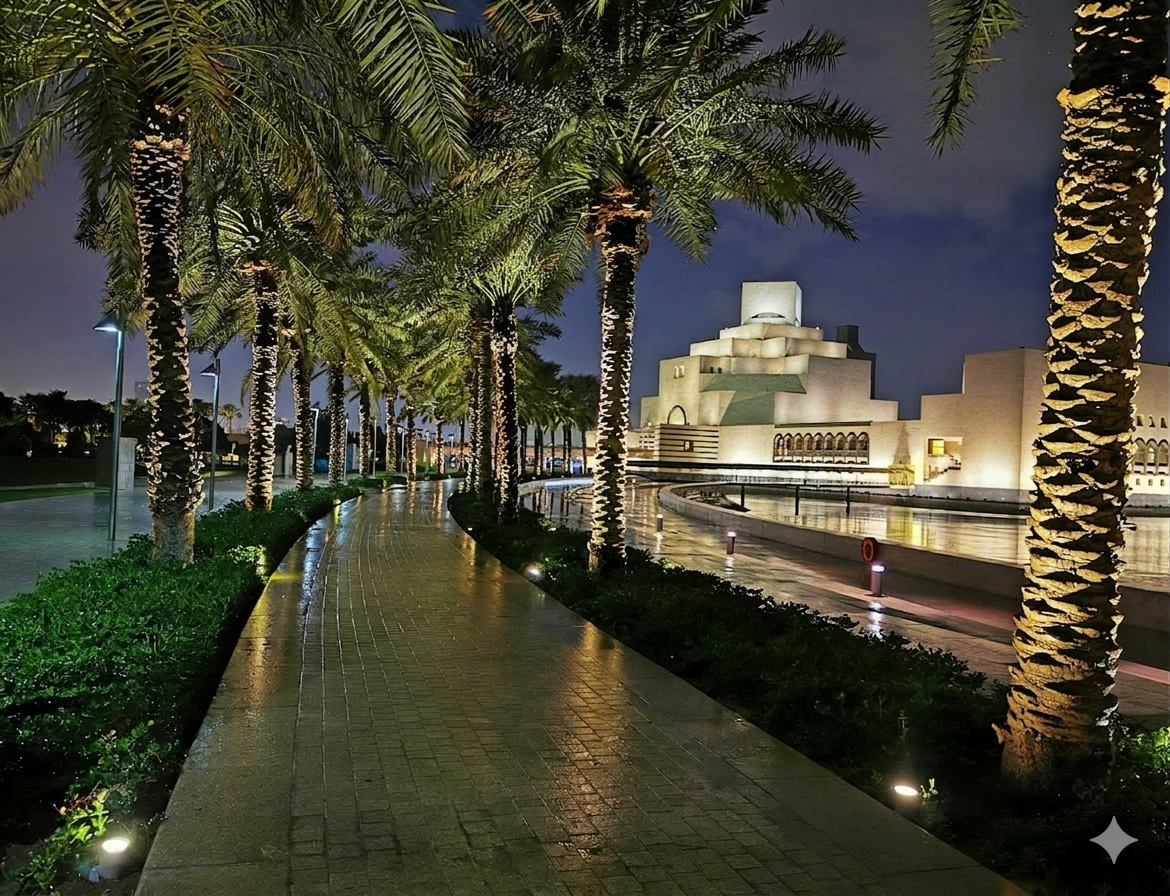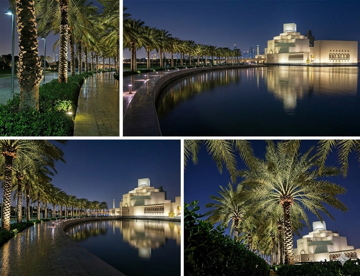 This architectural and landscape path lighting project at the Doha Corniche demonstrates the perfect balance between functional safety and aesthetic elegance. By integrating precision-engineered LED systems along the waterfront walkway, the design enhances the natural beauty of the palm-lined corridor while providing high-visibility illumination for pedestrians. The lighting is carefully calibrated to complement the iconic Museum of Islamic Art in the background, using sophisticated optical control to prevent glare and ensure a seamless transition between the built environment and the surrounding landscape.